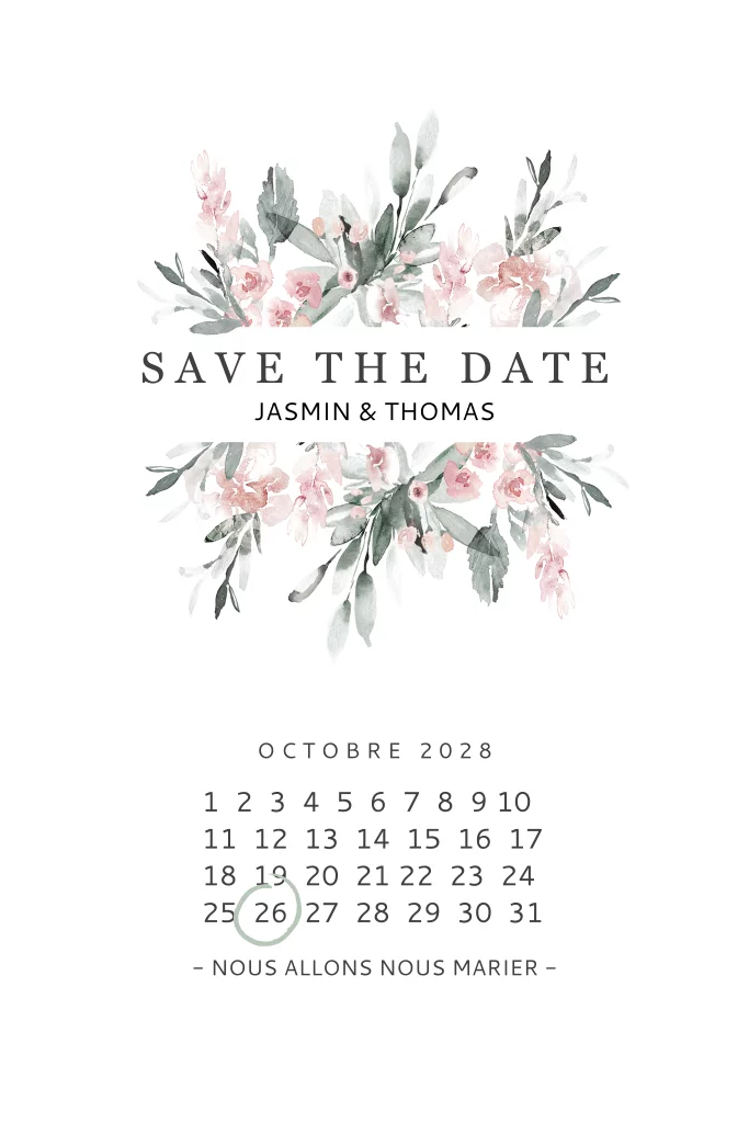Save the date avec un bouquet de fleurs roses et un calendrier