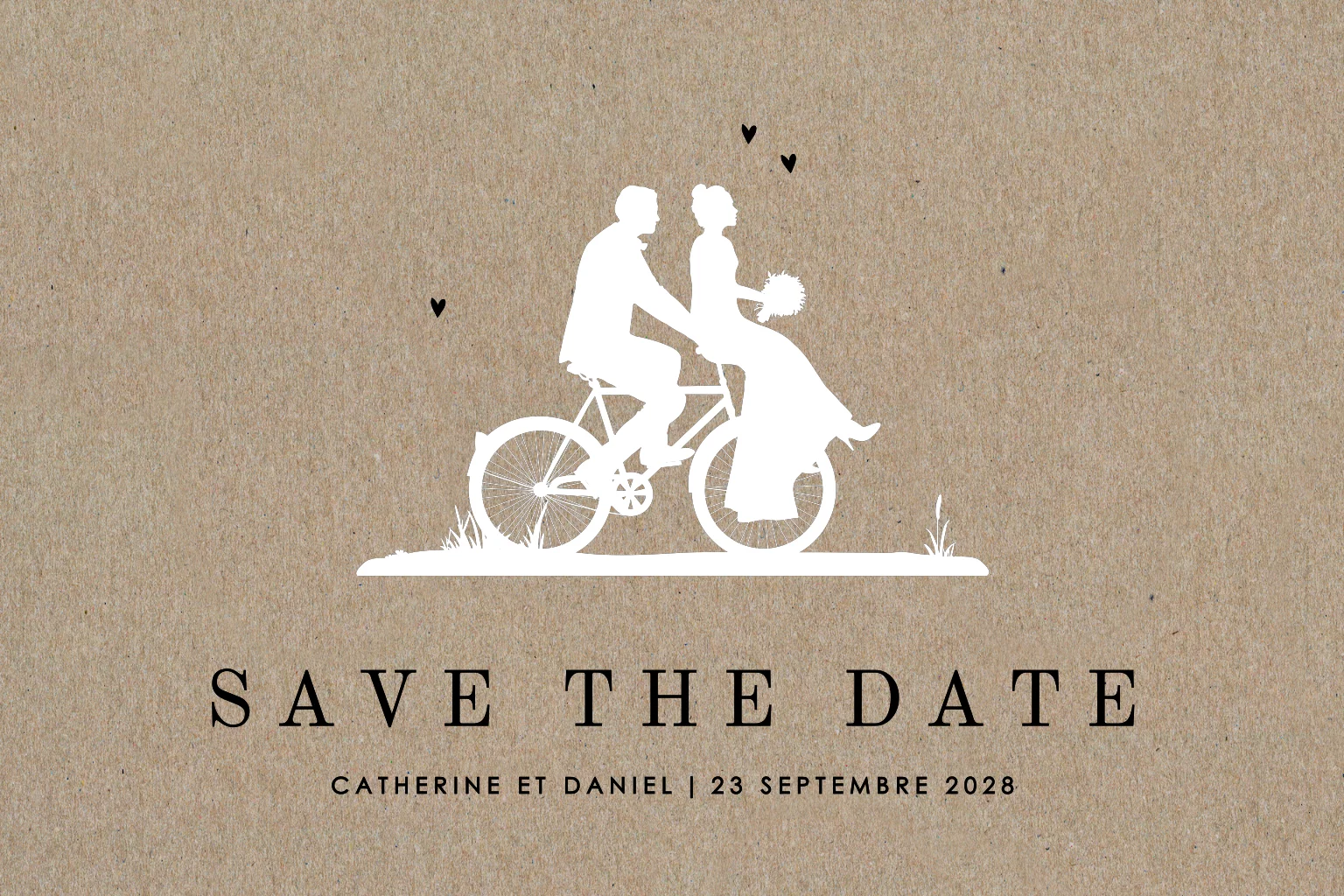 Save the date en papier kraft avec le couple de mariés sur un vélo
