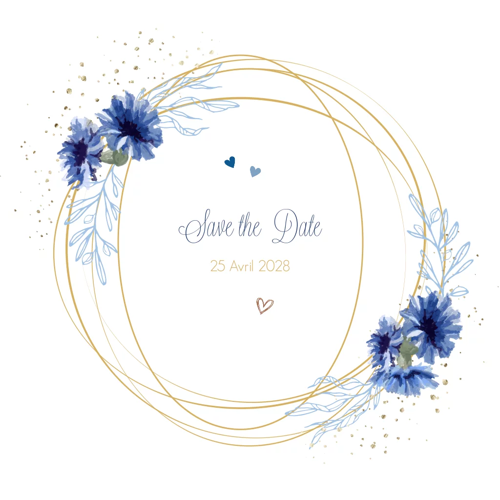 Save the date élégante avec motif géométrique et fleurs bleues.