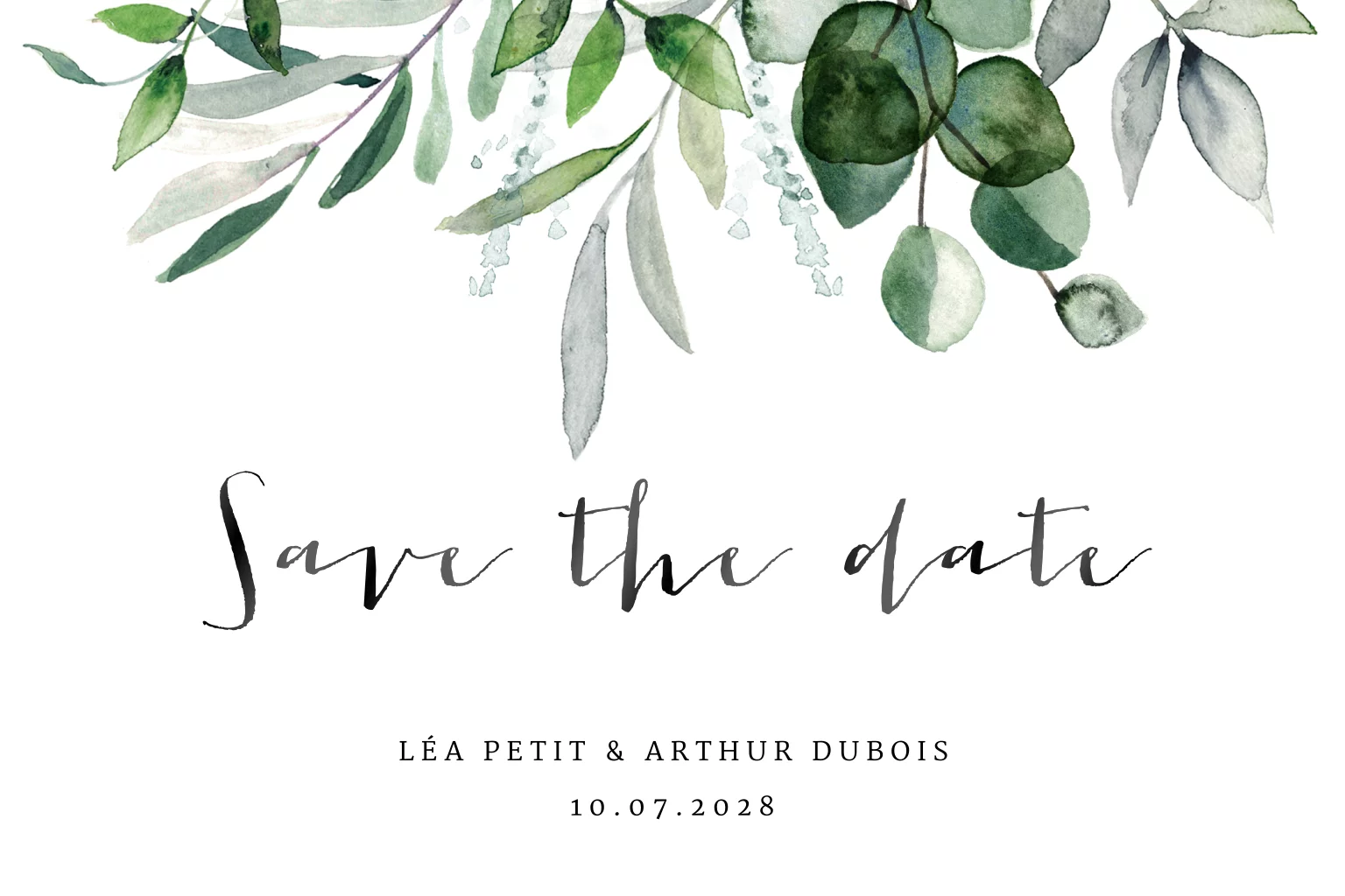 Save the date élégante avec des feuilles d'eucalyptus