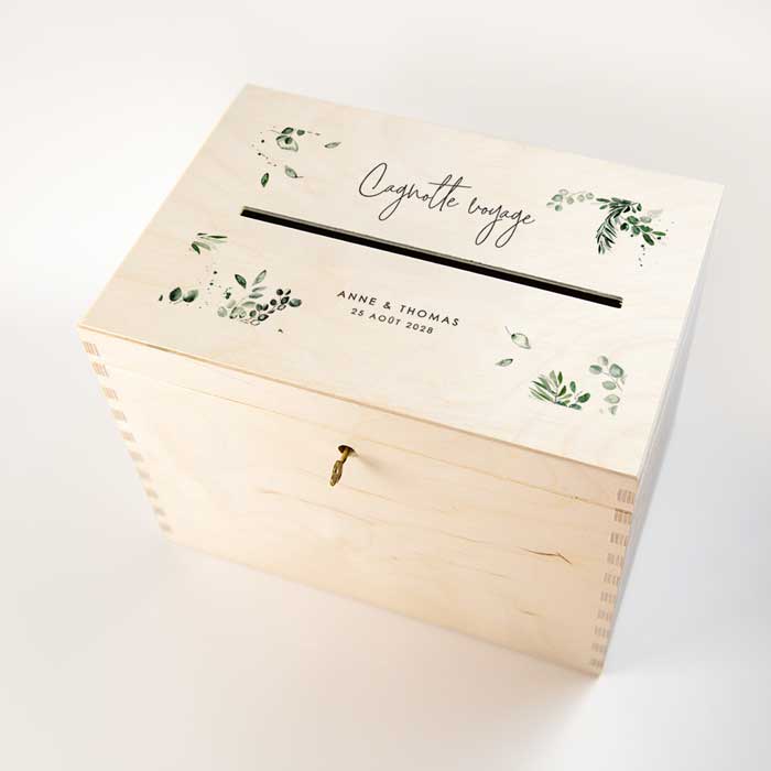 L'impression en couleur est réalisée exclusivement sur le dessus de la boîte. Grâce à notre technique d'impression spécialisée avec de l'encre blanche, nous pouvons intégrer des éléments blancs dans le design de la boîte en bois.