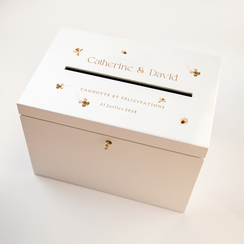 • Boîte en bois blanche avec fente droite : Réalisée en pin avec une finition White Wash, elle apporte une touche élégante et raffinée.