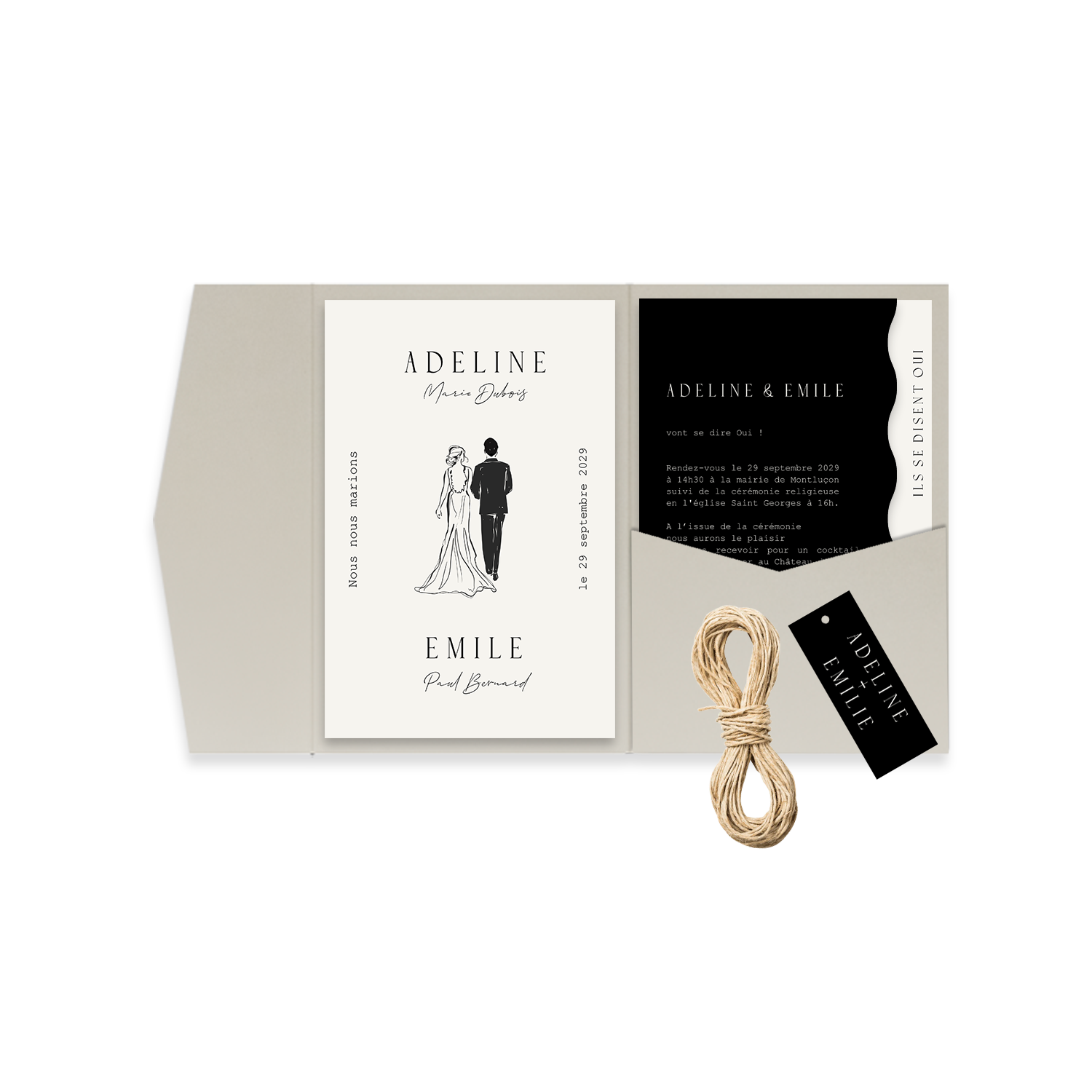 Faire-part de mariage classique pour pochette avec illustration mariés