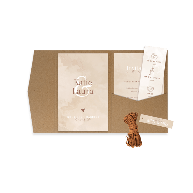 Astuce : Pour fermer vos pochettes, vous pouvez utiliser des autocollants personnalisés, des sceaux de cire, des rubans, ficelles, cordelettes ou cordons en cuir (prévoir 55 à 60 cm par pochette), ainsi que des bandeaux, à commander séparément.