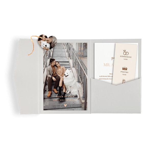Faire-part de mariage avec photo et dorure rosée en format pochette