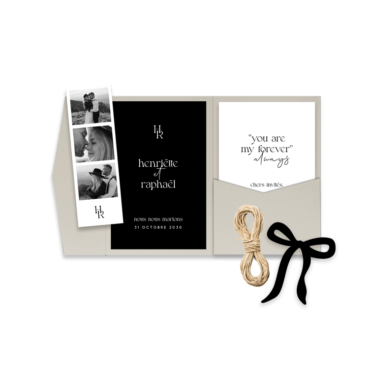 Faire-part mariage pochette élégant en noir et blanc avec photos