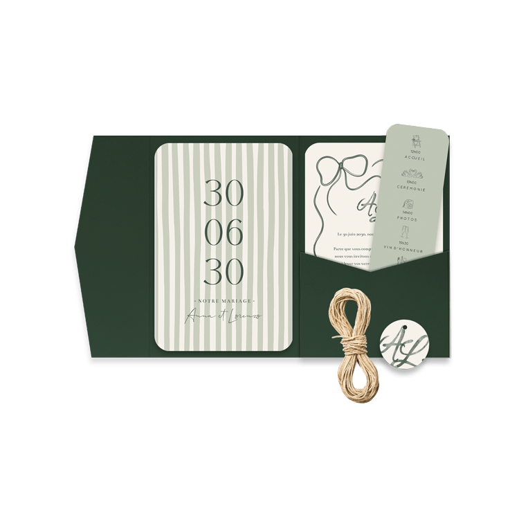 Faire-part pochette style rococo en vert, avec rayures et nœud