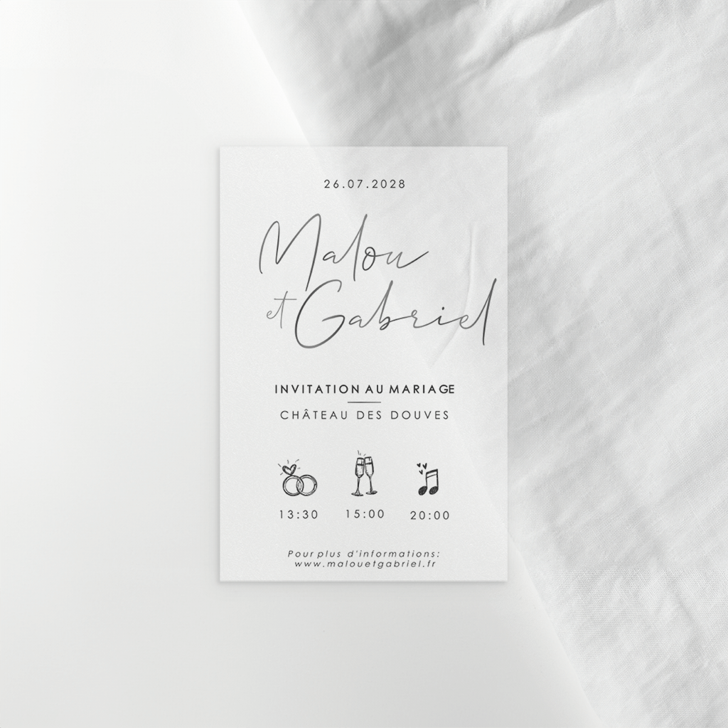 Faire-part de mariage en papier calque avec vernis noir